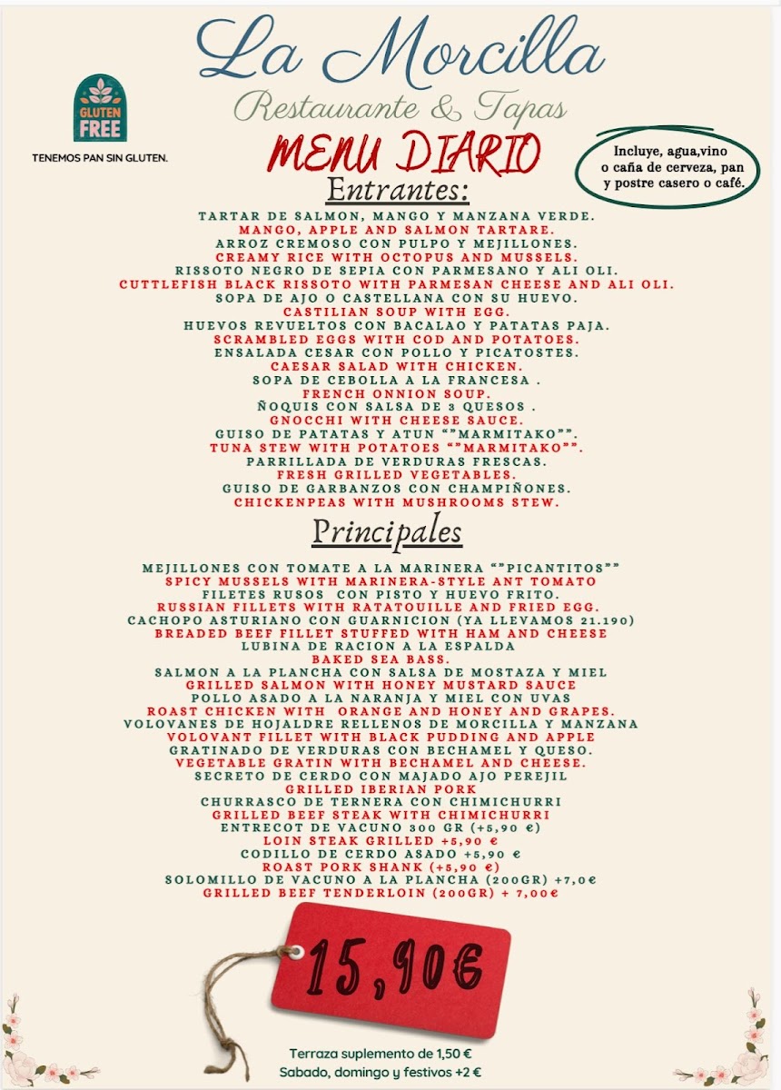 The menu at La Morcilla Restaurante y Tapas offers a variety of traditional Spanish and tapas dishes, reflecting the culinary influences of the region. The selection includes main courses, appetizers, and desserts that can suit different dining occasions, from casual tapas sharing to more substantial meals.